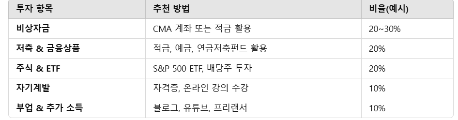 👉 사회 초년생이라면? 비상자금부터 마련하고, ETF와 자기계발에도 투자해 보세요!